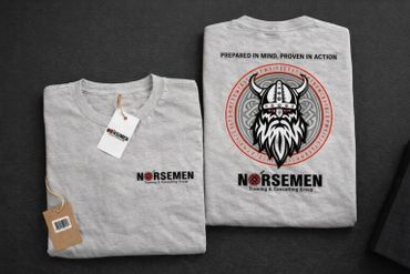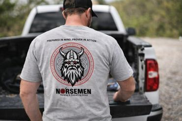 Official Norsemen Training & Consulting Group shirt featuring front chest logo and full-back Viking emblem with the motto “Prepared in Mind, Proven in Action.” Designed for training days, range work, and everyday wear, this tee represents the discipline, mindset, and community behind the Norsemen standard. Free shipping, USA shipping only.